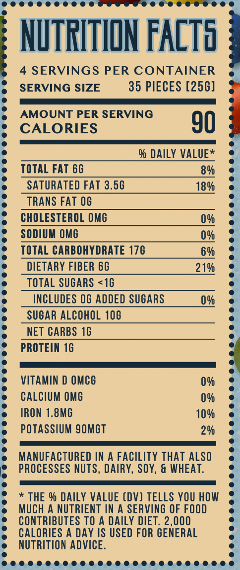 INGREDIENTS: Dark Chocolate [Unsweetened Chocolate, Prebiotic Fiber, Erythritol, Cocoa Butter, Sunflower Lecithin, Natural Flavor, Stevia Extract], Erythritol, Soluble Tapioca Fiber, Less than 1% of: Gum Acacia, Spirulina Extract, Turmeric Oleoresin, Vegetable Juice [Red Radish & Beet], Shellac, Carnauba Wax